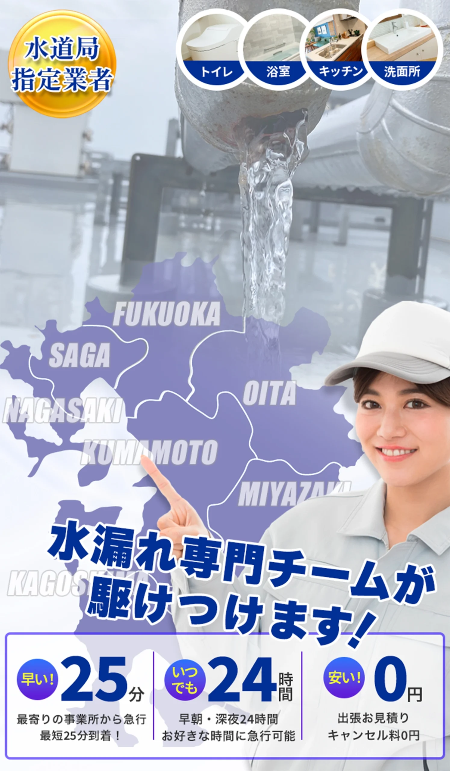 太宰府市内であれば、最短25分でスタッフが駆けつける体制を整えております。水道局指定業者として、高い技術と適正な価格でサービスを提供しておりますので、水漏れトラブルの際はぜひご相談ください。