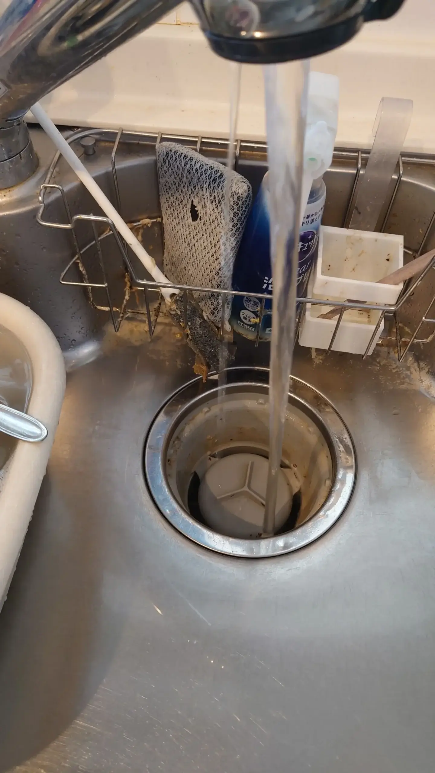 点検の結果、配管内部に油汚れや洗剤カスが蓄積し、排水不良を起こして内部圧が高まり、接続部から水が漏れ出していることが確認されました。