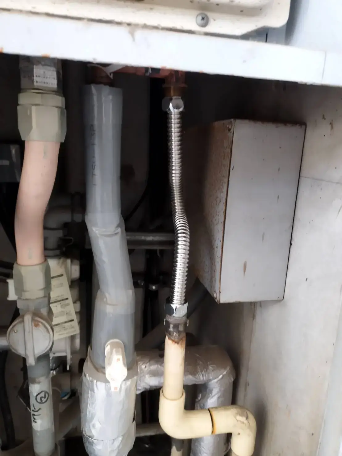 現場にお伺いした際には、給湯器の排水管から水漏れが見られ、調査の結果、給水フレキ管の劣化が原因であることが判明しました。