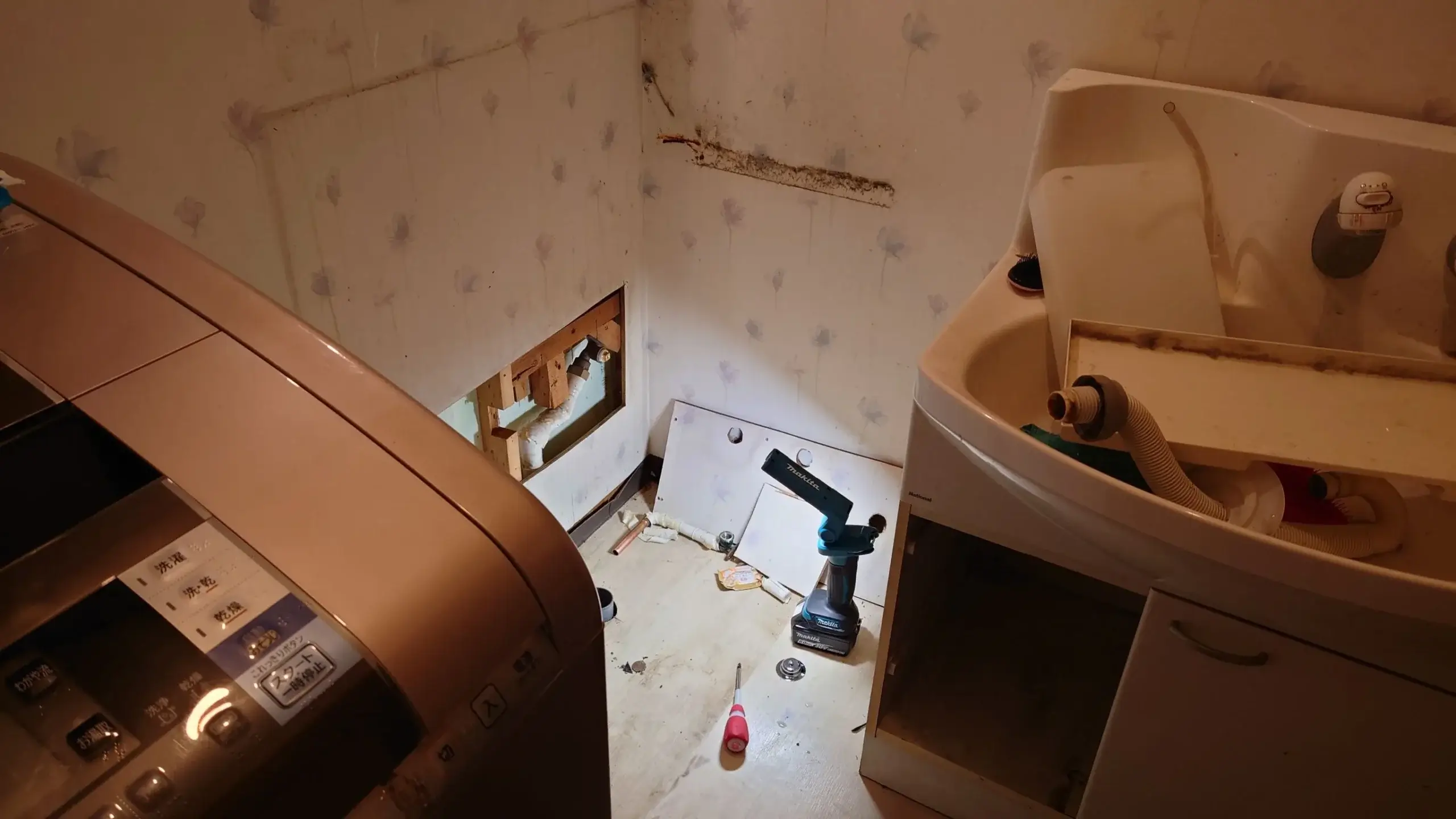 到着後は、作業員の方が蛇口と配管の状態を詳しく確認し、「部品の劣化による漏水なので、洗面台を取り外して止水作業を行います」と説明してくださいました。