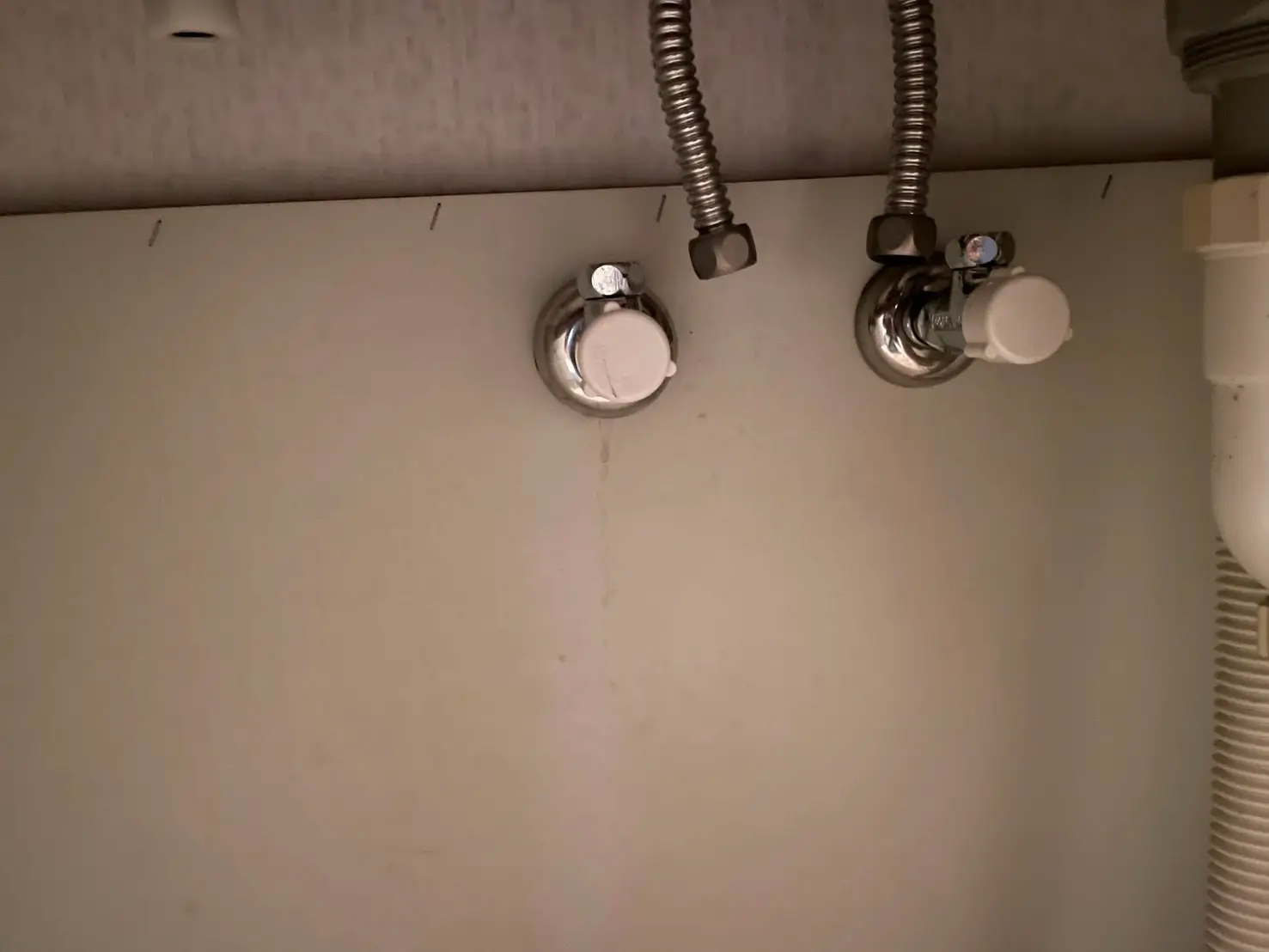 現場にて確認したところ、洗面台下の給水管および給湯管の接続部からの漏水を確認しました。